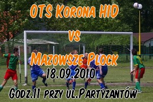 W sobotę [18 wrzesnia 2010] OTS Korona HiD Ostrołęka 1996 podejmie na boisku przy ul.Partyzantów Mazowsze Płock w 4 kolejce Mazowieckiej Ligi Trampkarzy.Rywal z Płocka po 3 kolejkach zajmuje 7 lokatę po wygranym meczu w Warszawie z Varsowią 5:2 ale potem gracze z Płocka mieli pod górkę co niesie za sobą dwa przegrane spotkania w stolicy 5:4 z Olimpią oraz 4:3 z Unią z którą zmiarzymy się w 5 kolejce ligowej.